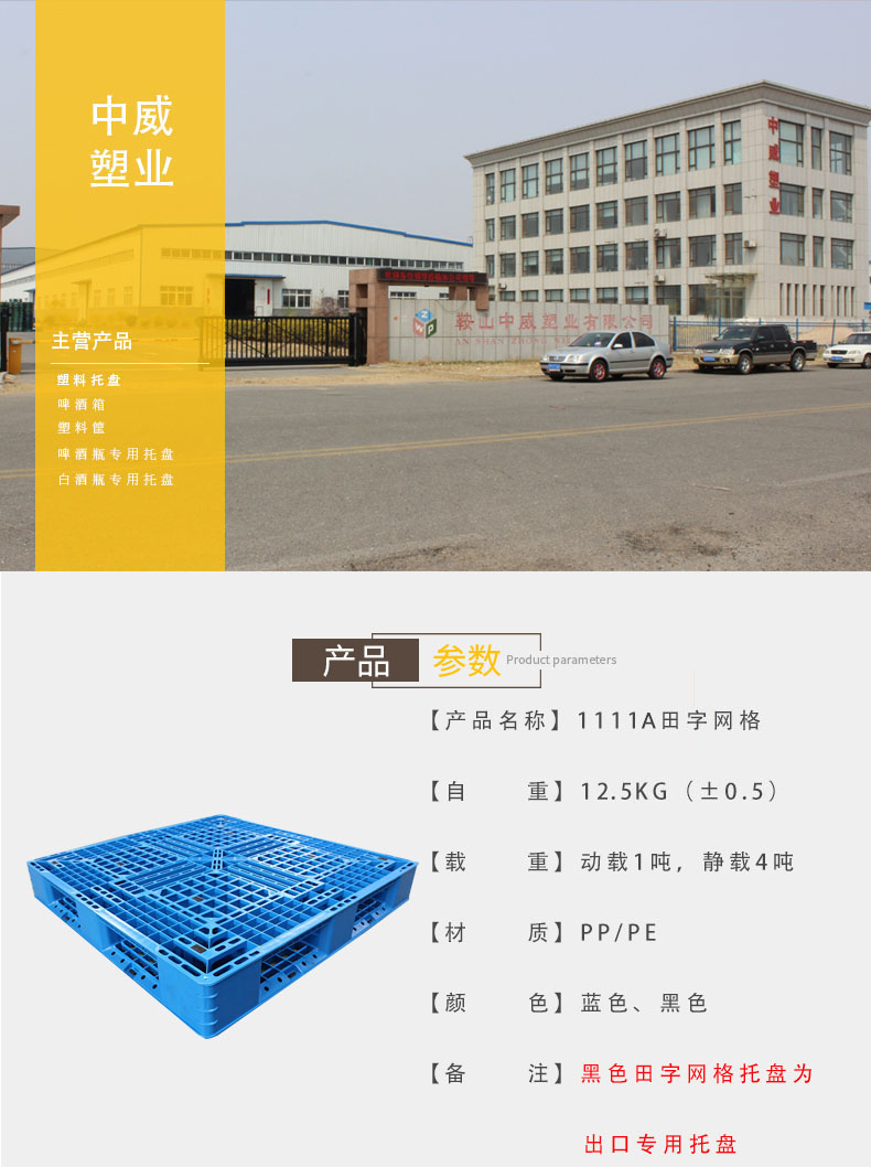 【尺寸】1100*1000*150mm 【自重】12.5kg(±0.5) 【載重】動載1噸,靜載4噸 【材質(zhì)】PP/PE 【顏色】藍(lán)色、黑色 【備注】該產(chǎn)品在進出口貿(mào)易(一次性托盤)、汽車、食品、煙草、醫(yī)藥、造紙、酒店,印刷、電子電器、化工、服裝、紡織、倉儲物流上都有廣泛的應(yīng)用